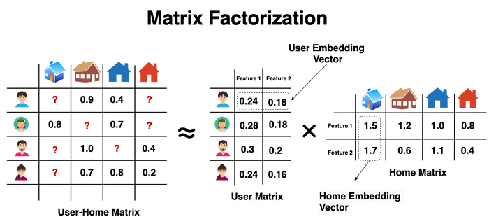 위 그림2는 직관적으로 Matrix Factorization를 이해하기위해 가져온 그림이다. 왼쪽 User-Home matrix가 데이터에서 사용자별로 집에 대한 선호도를 나타내는 행렬이다. 이를 사용자, 아이템 행렬을 잠재 변수 2차원으로 분해한게 오른쪽 그림이다. 두 행렬간의 내적곱으로 사용자가 Home에 대한 선호 추정치를 구하고 이를 실제 선호도값과 비교하며 반복해서 학습하게 된다.